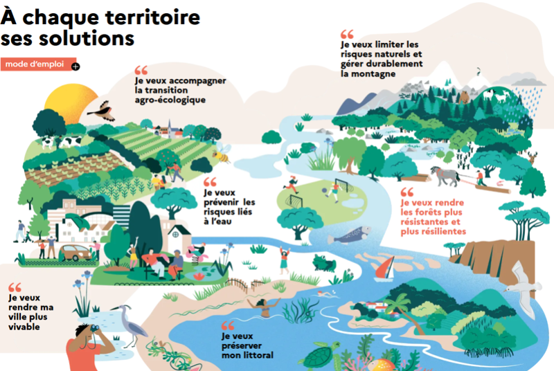 - Une Boîte à Outils en ligne des SfN pour l’adaptation de nos territoires au changement climatique à destination des techniciens. Vous y trouverez des parcours détaillés, pour mettre en œuvre, étape par étape, une SfN pour l’adaptation dans différents types de milieux. Cet outil offre des contenus adaptés à tout type de territoire et de contextes environnemental et climatique (forêts, littoral, montagne, urbain, agricole, etc.). :